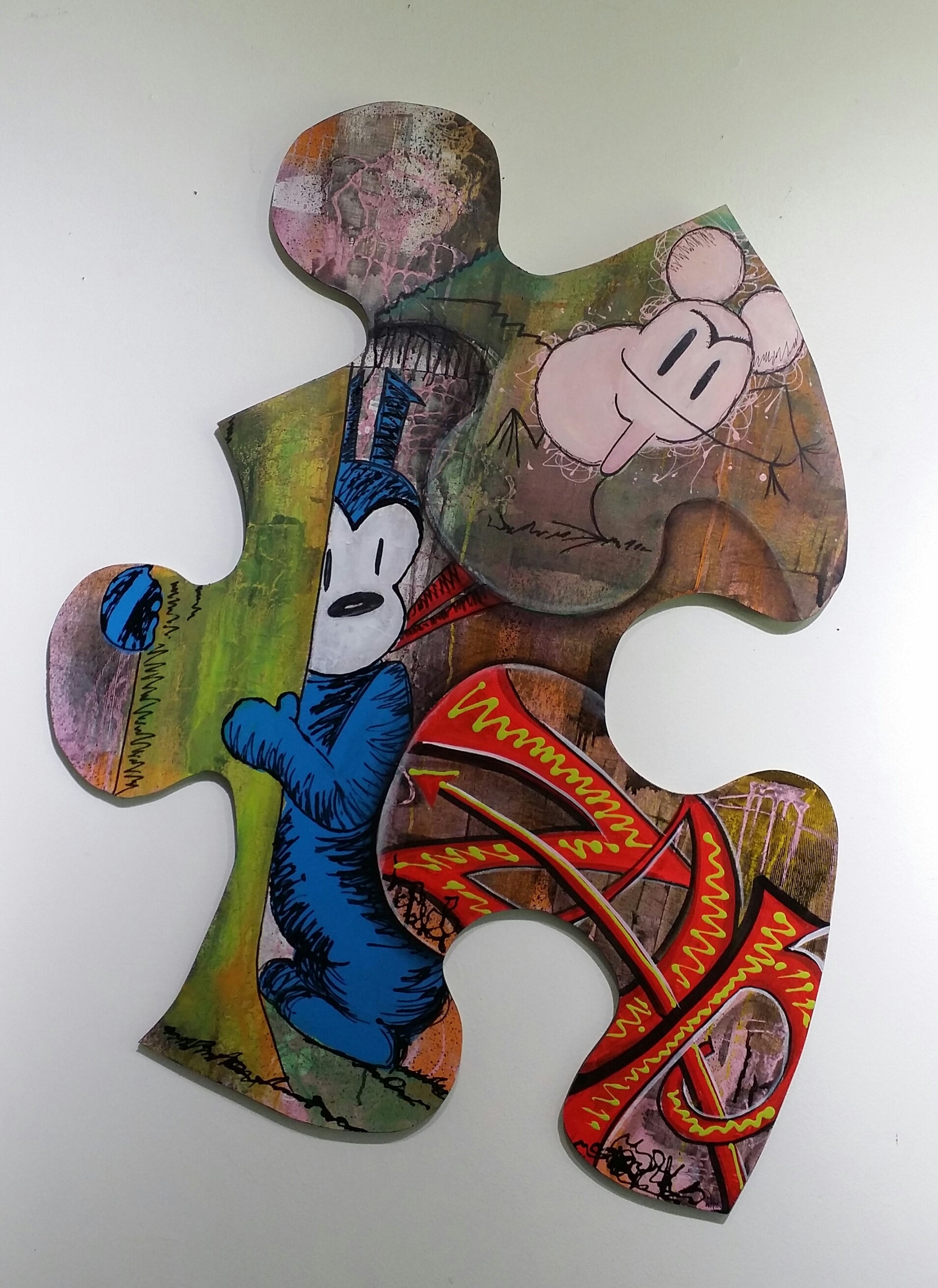 One of a kind original mixed media painting on birch wood. This pop cartoon series is based off the George Herriman Comic strip "Ignatz and Krazy Kat" that originated in the early 1900's.